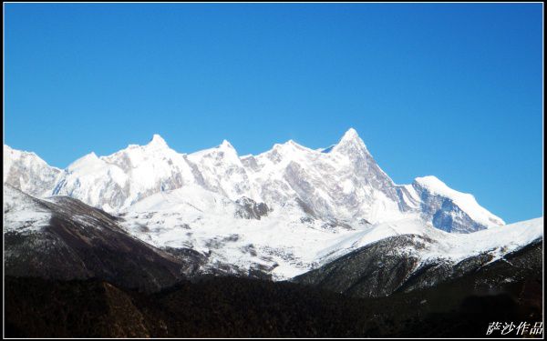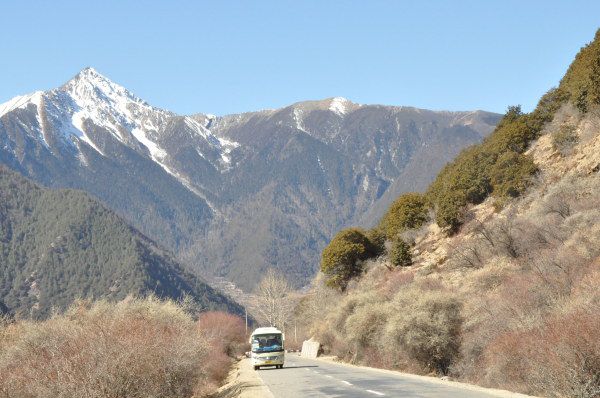 车行至鲁朗,道路上渐渐有了冰面,两侧的山峰顶部铺着厚厚的积雪,谷内郁郁葱葱的针叶林是著名的鲁朗林海,远处高耸的南迦巴瓦闪着熠熠的光彩。