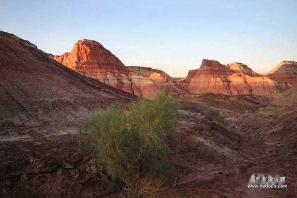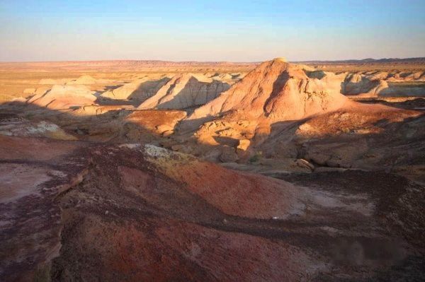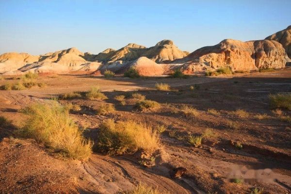 落日后,天空虽无晚霞但余晖满天。整个五彩城安详、静谧而又透着未知的神奇。那些不远处朦朦胧胧的小山触发着我们无限的遐想。
