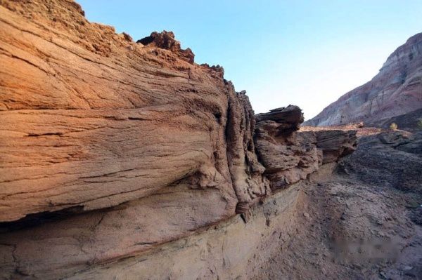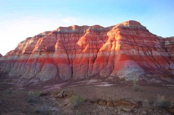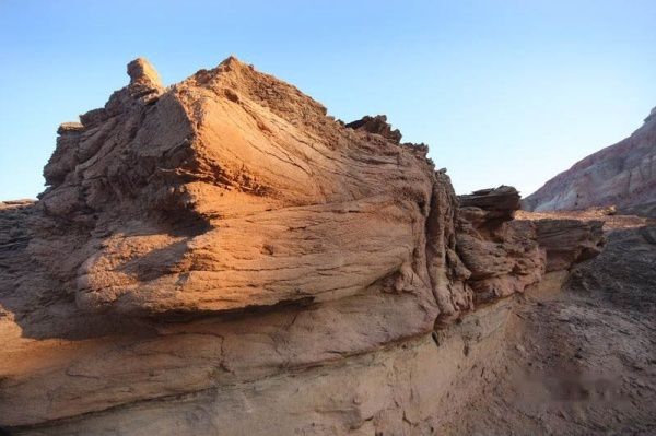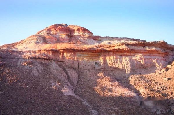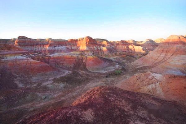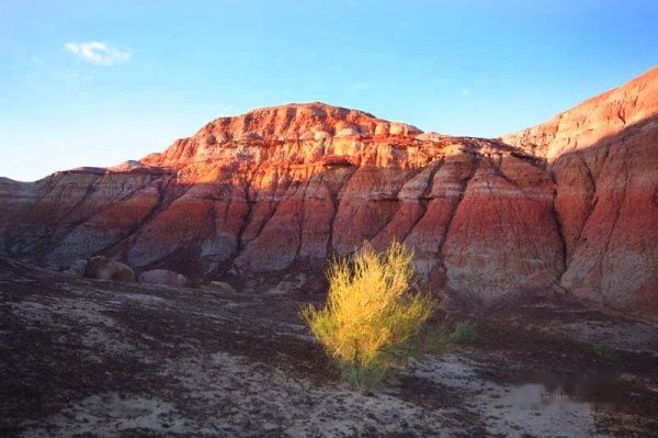 早晨,我们驱车去五彩城拍日出。一轮红日从地面喷薄而出,射出一屏孔雀尾状的金辉,蓝宝石一样的天空飘浮着一朵朵羽绒般的彩云,此刻五彩城就像一个出浴的圣女,秀雅而多姿。那些被阳光镀亮的彩色山丘玲珑剔透,就像一把把张开的彩色小伞。几个高高耸起的山丘,裹匝着十几种不同的彩带,就像娇羞艳丽的沉静美人伫立在晨曦之中。你会深深感觉到大自然是如此瑰丽,生命和生活也变得热烈丰富而充满情趣。