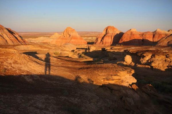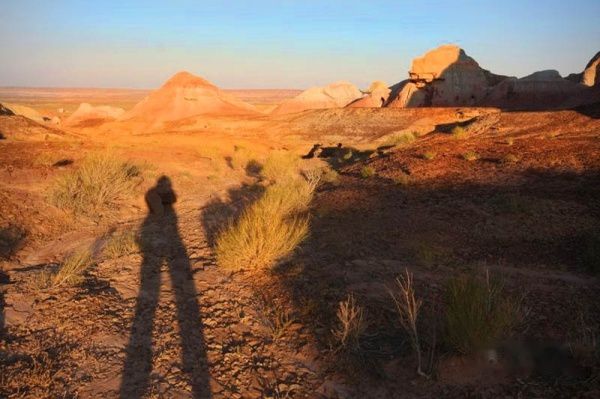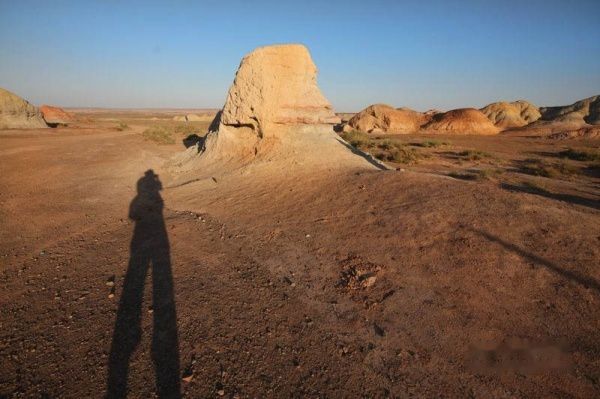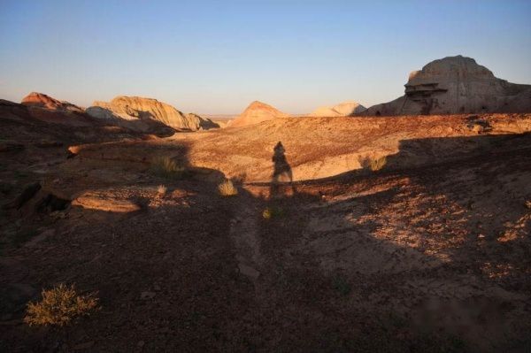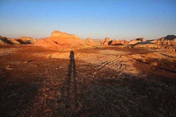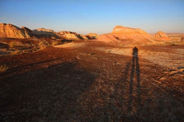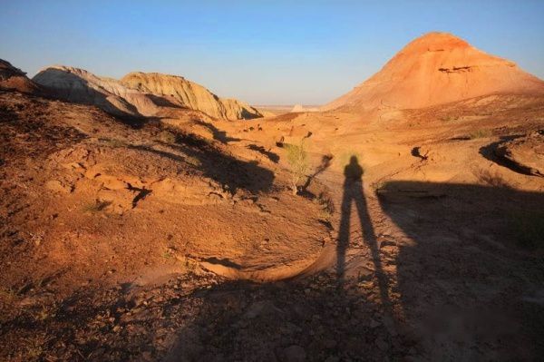 非常惬意地拍摄,拍那些五彩山丘,也拍下朝阳投射在地面上自己长长的身影。穿行于这些今令人眼花缭乱的山丘之间,仿若走进迷宫,稍不留神,便找不着归路。在这里游人迷路的事常有发生,我们同行的C女士就遭遇了一回。急得她出了一身冷汗,因祸得福的是在某个山顶上她拾到了好几块晶莹透明的石头。我也拾了几小块不同颜色的小石块作为此行的纪念。