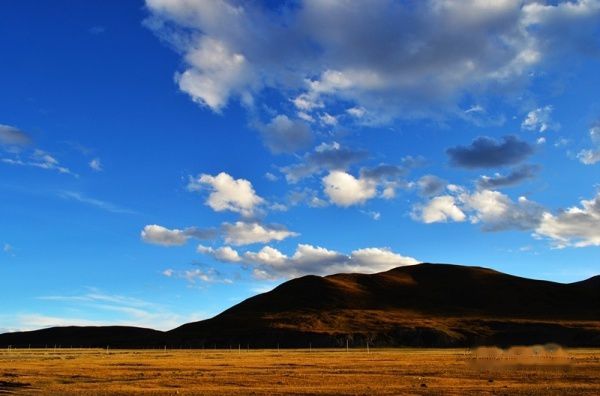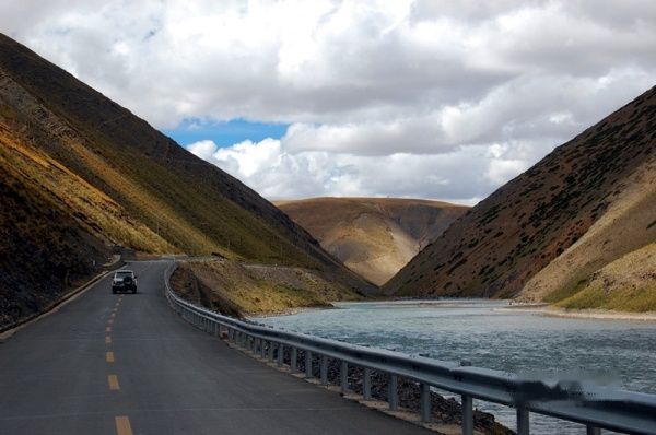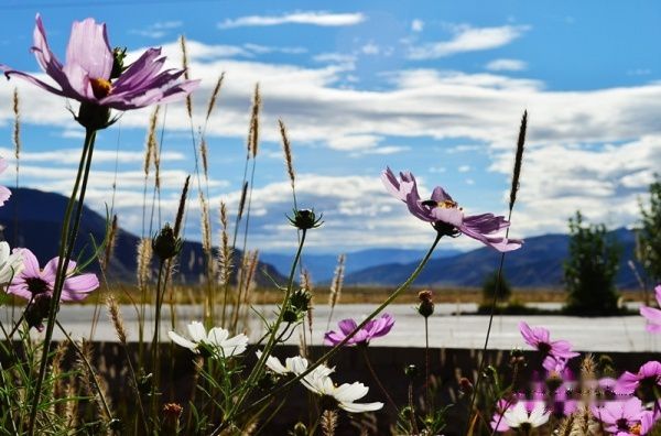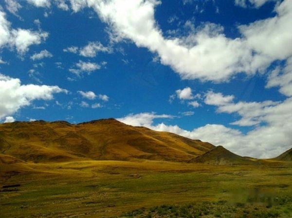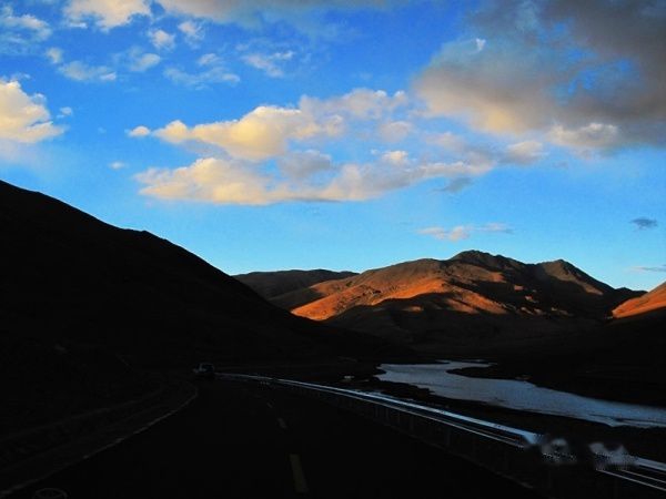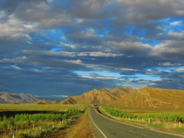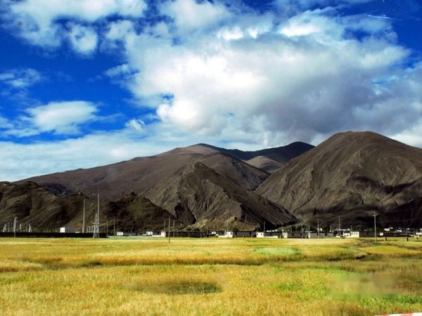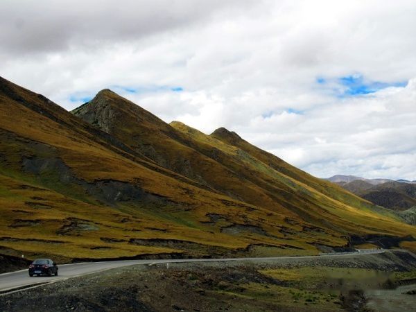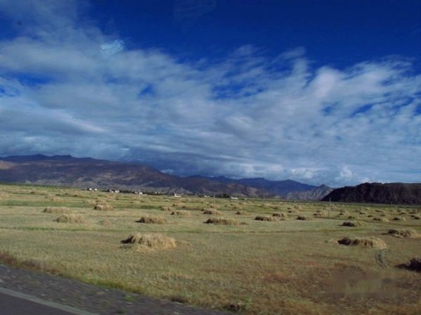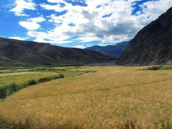 道旁的青稞熟了,一块块金黄色的青稞地正等着收割,藏民们在这样美的环境里耕种,心情该是多么愉悦!
