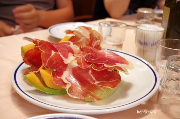 晚上本来想去吃不错的意大利菜,可惜朋友推荐的两家,一家关门装修,一家订满了没位子,只能随便找了一家别的,应该说是一般,映象比较深刻的也就一道意大利式开胃菜——哈密瓜夹生火腿(Prosciutto crudo con melone)。