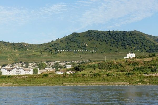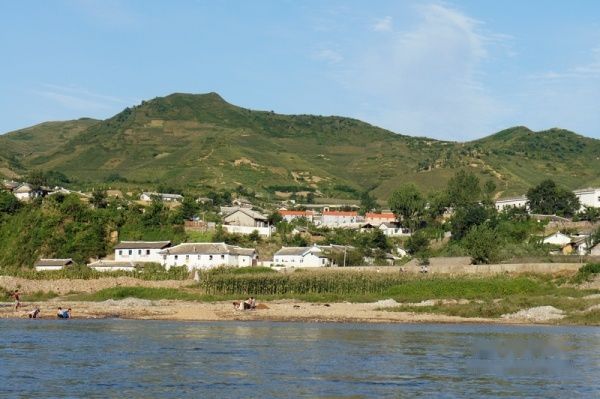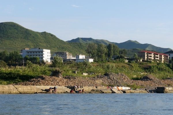 岸边有妇女洗衣,儿童玩耍。朝鲜的经济状况不好,经常发生小孩向游客要钱的情况。