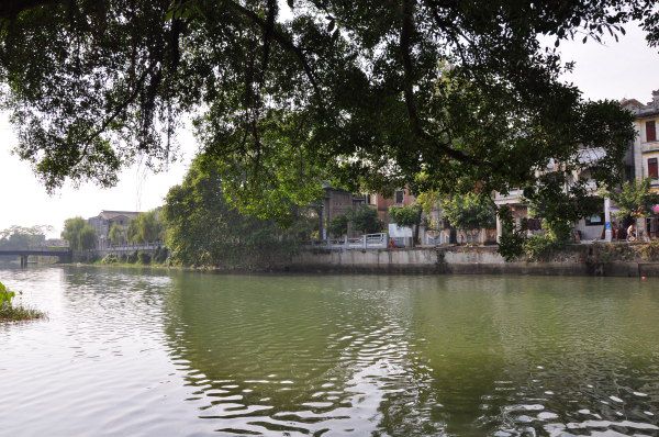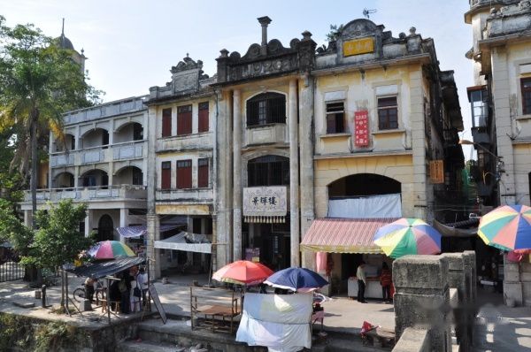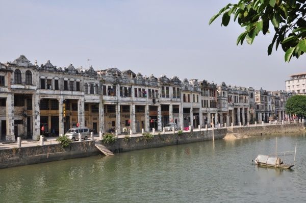 赤坎也是开平侨乡的著名古镇,位处潭江之滨,河涌交错,是开平重要商埠和通往阳江的水路交通枢纽。若从司徒氏家族最早在顺治初年在赤坎东头潭江边摆摊交易算起,赤坎古镇距今已有350年历史了。不过,那时的店铺均为砖木结构,长方形、瓦顶,十分简陋,没有造型变化,是中国南方的传统式建筑。民国十五年(1926)以后,拆铺扩街,主街道从上埠(起自今关族图书馆,位于下图左面)至下埠(止于今司徒氏图书馆),沿潭江北岸筑长堤,建起了钢筋水泥结构、楼高两三层甚至四五层、造型多样、风格各异的骑楼式店铺,一间接一间,倒影在清澈的江水中,美不胜收。这就是今日被称为“欧陆风情街”的长堤建筑群。