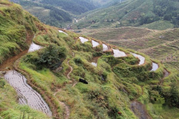 到了山脚下,最让人注意的还是那雷人的标语。在猪栏门的两边贴了献身国防和计划生育标语,有点搞不清是什么意思?呵呵!天放睛了,那晶莹剔透的露珠惹人喜爱。我们走在湘黔古道上,爬到了半山腰,荡胸生云层,回头望望那层层梯田,像一根根生命的音符,在弹奏着那千年的古韵......,诉说着苗族先民不屈不挠开山造田的精神。