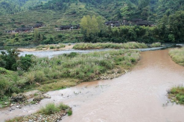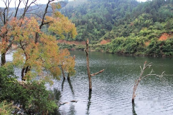 走到了麻塘镇,看到了难得一见的泾渭分明,还有红树矗立在水中,有点九寨沟的风光,河中撒网的鱼民,和山上红树的倒影,构成一幅浓浓山水画,车在岸上行,人在画中走。