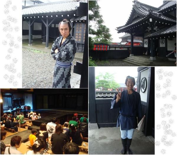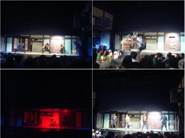 上图中左下图是为了表现中剑流血的一刻,经过之前一系列快节奏辗转腾挪的打斗,突然在此刻戛然而止,音乐也骤停,一瞬血红的舞台,让人心中亦如被突然击中的感觉般,陡然一震,可以说这台动作戏演出的节奏已经被演员掌握到炉火纯青的好,时刻揪住人心。虽然我听不懂,却也为他们的精湛表演鼓掌喝彩。演出持续25分钟,结束后大家踊跃地向舞台上扔纸包钱~~十分有趣!江户的风情嘛~~