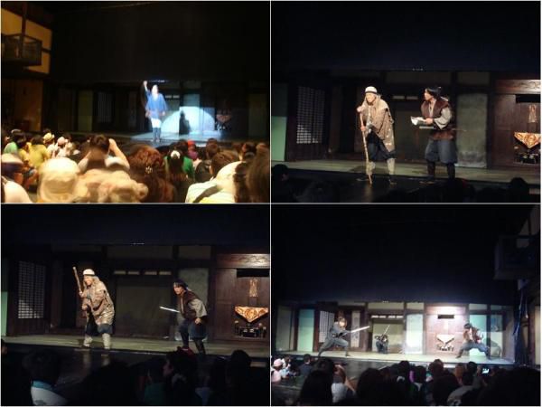 主要是讲一对师徒(还是爷孙??)和另一对忍者为了一卷忍术秘籍争斗的故事—我大概猜的,因为我真的听不懂超⊙﹏⊙b汗~!即使如此我依然兴致勃勃地看完了全场,因为其中夹杂了很多笑点和滑稽演出,演员都很敬业。演出前段是诙谐搞笑轻松为主,中段以后慢慢加快起节奏来,进入到紧张的对峙与激烈的斗争中。