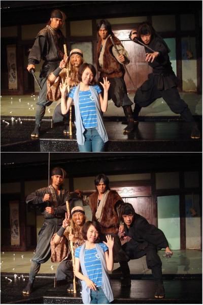 之后演员们开始为观众合影服务,我当然不能放过这个机会,要求拍了两张!我觉得我当时嘴都歪了笑傻了美翻了~~~~与忍者们的合影呀!!!哇咔咔~!这是真正专业性质的cosplayer啊~~!