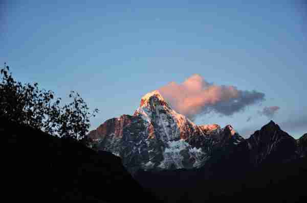道下山, 刚走了 3 分钟不到, 透过茂密的树林, 看到日照金山闪亮登场, 等我急速下到能拍幺妹峰全景的地方, 只能