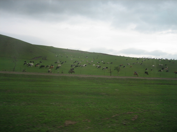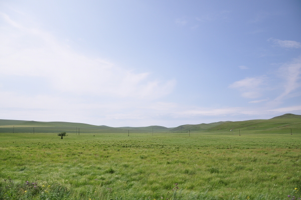 额尔古纳到海拉尔,行驶在一望无际的美丽的呼伦贝尔大草原上,羊群,奶牛,牧羊犬,好一派草原风光。