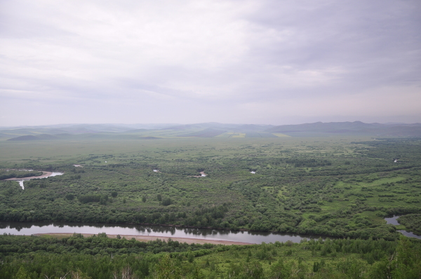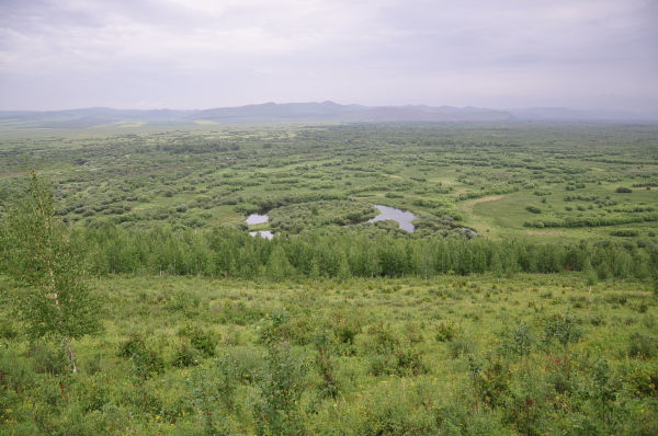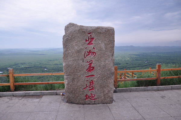 进景区大门搭了辆上山接客的出租车,一直到山上,爬上山顶可以俯瞰整个根河湿地。一块刻着“亚洲第一湿地”的巨石立在山顶,据说这里是中国目前保持原状态最完好、面积最大的湿地。