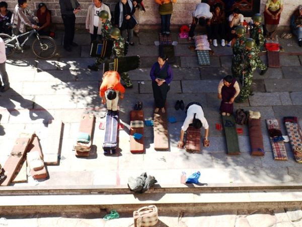下午和晚上出外照相。八角街、大大昭寺前游人不多。商店依旧琳琅满目,社会次序良好,生意不如从前。在春季拉萨暴乱中被焚的建筑大多已修复,还有几处未修好的残垣断壁向路人揭示着曾经的暴行。大街有军人巡逻,小巷有武警站岗。说实在的这很让我不习惯,我也是见多见多识广的了,在国内旅游地还是头次见着。但是,有他们的存在,才让我能如此放心地在拉萨随处乱逛。10年前来拉萨,众多衣着褴褛老、少乞丐抱着游客腿不放,强讨的景象至今印象深刻,这次没见着一个。5年前二进拉萨,许多满面红光、打着手机也加入了乞讨大军的僧人很是让我反感,如今也是一个没见着。因为根本没有见着乞讨者。拉萨的进步与发展变化是显而易见的。
