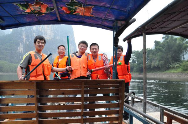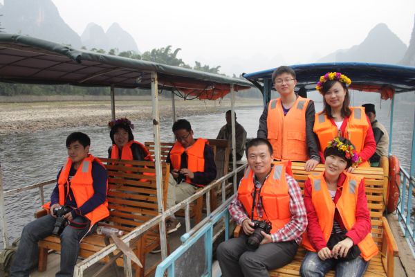 09:30 唱完歌,8人分两筏,开始了漓江的漂流。筏子比遇龙河那种要大的多,有柴油动力。其实坐上6、7个人没有任何问题,但旅游局规定乘客最多4个。我们要求师傅把两个筏子绑在了一起,形成了一个小平台。不仅平稳,活动空间也大了很多。