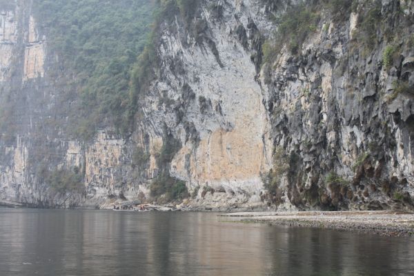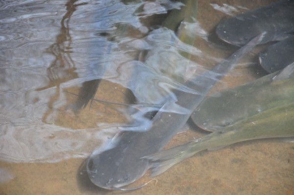 11:30 因为要避开大船的封航时间,我们在半路下了筏子,到右岸边一家饭店吃饭。这家店没有名字,就在岸边。点了几个家常菜,要了最有名的剑骨鱼。怕不是正宗的,我特意去考察了一番,非常鲜活的鱼,养在河沟边的一洼水畦里面。
