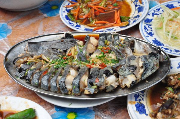 听了主人讲解了剑骨鱼和毛骨鱼的差别,才相信了它的血统,挑了一条中等大小的,2斤2两,清蒸做法。上桌后,鱼的味道果然鲜美,其他菜蔬也不错,精细不足,但贵在新鲜。人均35块,挺好的。
