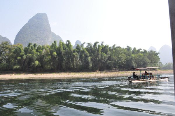 今天气温稍高一点,但雾气较重,不适合拍景色。相比遇龙河,漓江两岸的景致要壮丽许多。竹筏速度快,站在船头,清风袭来,更觉爽快。河面宽阔,河水较深,却又清澈见底。