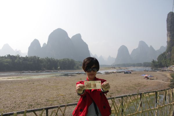 13:30 完成了漂流到达兴坪码头。我们还在奇怪怎么杨师傅没让我们拍20元人民币上的景色。原来那个景色要上岸后,走过去一小段才好拍。20块包了一辆蹦蹦车到古镇,半路把我们放下来,大家拍够了那20元的风景。