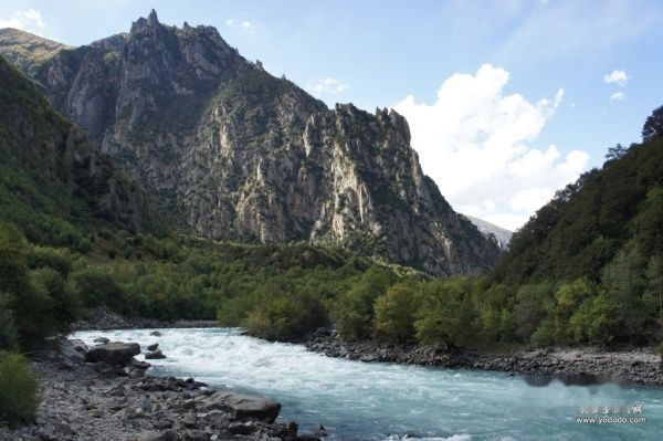 我不禁感叹,古老苍凉的西藏竟然会有如此一块风水宝地!我们在中流砥柱等景点照相休整,远眺卡定神山的天佛瀑布,只看见落差近200米的瀑布飞流直下,宏伟壮观。山崖天然形成大佛、女神、观音、护法等等,清新自然的天然氧吧使我们无限陶醉,真正领略了“人+山=仙”的天人合一境界。