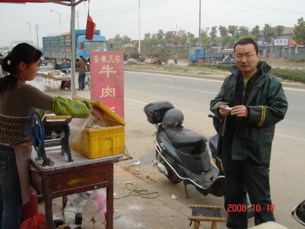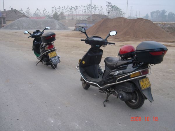 就是后面这辆,看到两车间的白线了吗,是江湖行到路边大棚上“借”的,吼吼。这时天刚刚亮,早上六点来钟小冷风一吹,出行的兴致一下被倒了盆凉水,现在的问题是继续前行还是打道回府。。。。。。。不管怎样先得把车修好,一看路边一是没有修车店,二是还都没开门,经过短暂的商讨决定继续前行到下一站--齐河县。就这样一前一后拖着我一个小时跑了三十多公里,七点二十分到达了齐河县,几经打听找到了一个摩托车市场,不过几个店还是没有开门,不管了,按照门头上的联系电话打过去,还真有人接了。老板娘还没起,好说歹说总算起来开了门,可修车师傅还没到,好好说歹说请师傅早点过来。