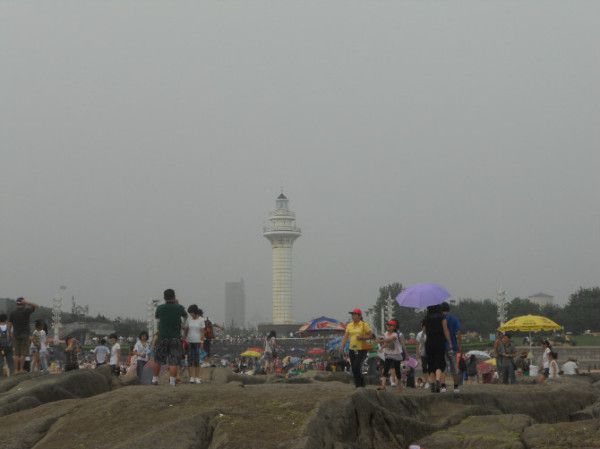 大约十点半下的高速,离吃饭还有一段时间,地接导游说首站先去灯塔风景区。日照的灯塔风景区离日照港很近,临着。在灯塔风景区逛游了二十分钟就集合回车上开往下一站:万平口生态海滨广场。听导游讲说:万平口,寓意“万艘船只平安进港口”,很吉祥的含义。由于万平口的时间放的比较少,大家都没有下海游泳,大约一点多钟的时候开始去吃中饭,这时天空有些阴暗,到了吃饭附近的停车场时,两个暗雷之后,哗哗地下起雨来,由于很多人都没带伞,雨下的很急,大家也都走到半路了,个个见雨就跑,一哄而散,大家都避雨去了。淋得跟落汤鸡似的。吃饭的时候由于衣服很湿,连座位都不愿意做了。吃过午饭之后已经接近15:00了,去了海产超市,大家迫不及待的要去游泳。这时的天空已经放晴,还见到了浅浅的彩虹那。