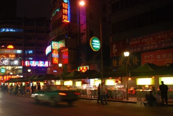 夜晚逛了合群路夜市小吃街,7点半后整条合群路两侧大约300多米,主要卖吃食为主,它囊括了贵阳所有的小吃。夜市上卖得最多的是烧烤,且种类繁多。因同伴畏惧麻辣,所以只吃了“留一手烤鱼”便撤退了。