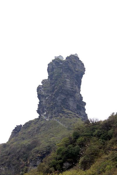 新金顶对面如屏风一般的山头就是老金顶的所在,一侧有闻名遐迩的蘑菇石和翻天印。从右侧峰脊的石阶上去就是游人徘徊留恋,奇石汇聚的地方,蘑菇石之类的怪石近看却少了很多意趣。向左侧山脊走是老金顶的果然寺,我迷恋于这个名字,但听山上下来的游人说:道路艰险、没有护栏,他们都撤下来了。看看我的时间不多,只能遗憾地打消这个念头。