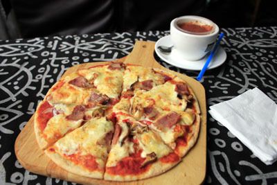 出了奶茶店沿着小巷往回走,看看时间已经到了午饭了,只是吃了几天辣、油腻的东西,实在想换换胃口,于是在沿江唯一一间西式咖啡店——soul coffee坐下,点了一个博饼的培根披萨,味道居然也不错。