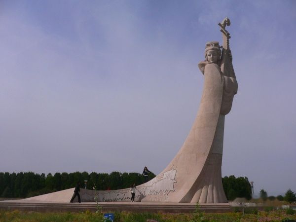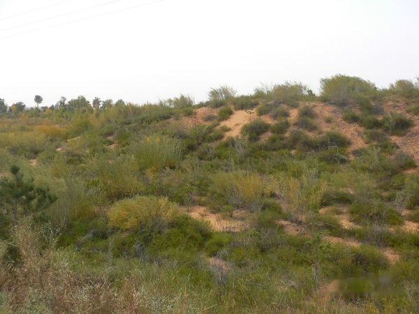 高速榆蒙段90KM路纵横毛乌素沙漠,地广人稀沙多草茂,高速路常常分开各走各的,不像内地双向四车道并在一起,我想这里的沙地不必节约,这莫个思路可能为了覆盖沙漠,同时减少修路经费。喜悦的是:沙漠在人们心里的印象竟是如此的祥和,各种不知名的草木色彩斑斓、茂密的生长在沙丘上,覆盖率在70%以上,远望几十里方圆不见裸露的黄沙,真不简单。车很快82KM从红碱淖高速口下了,再18KM到了景区门口,前行500米看见王昭君塑像。