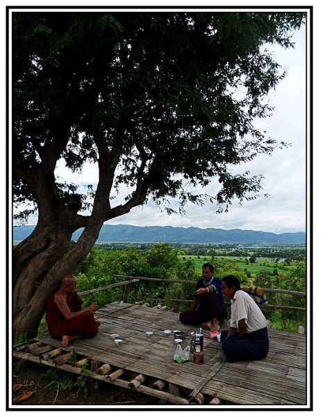 在庙里吃喝是不要钱的,只要自己捐点钱就可以,多少自己决定。离开这后,我们又穿过了一个村庄,来到了另一个庙,庙后的大树底下,一个和尚和一些村民正在聊天,而他们的远处,就是美丽的茵莱湖和水鸟镇,真是惬意!
