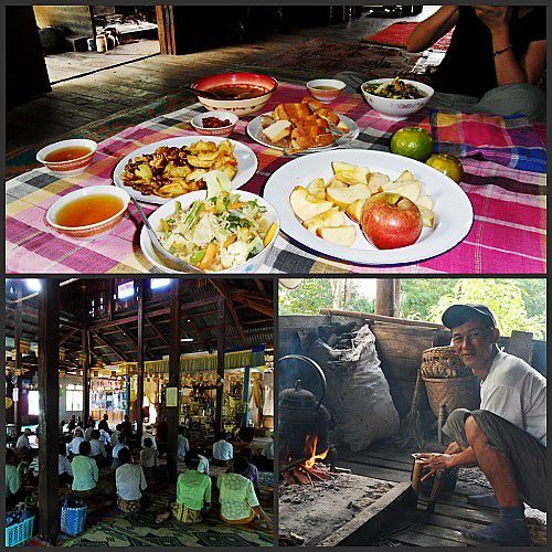 我们继续往前走,便来到了一个大庙,里面有许多村民在一位和尚的带领下,正在颂经文。我们悄悄进来,Min Min便开始利用庙里的东西为我们做饭,饭还没好,我便四处走动。这时,村民们也颂完了经,有一位带眼镜的大叔向我招手,我过去后坐在他的身边,他用英语问了我很多问题,得知我是从中国来的,他很高兴,他说中国是发达国家,我吓了一跳,解释道,相对于缅甸,中国是个发达国家,但相对于美国和欧洲国家,中国还是一个发展中过家。