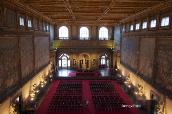 王宫2楼是个可以容纳五百人的大厅。由瓦萨里及其弟子描绘的顶棚画以及覆盖整片墙壁的华丽湿壁画,令人叹为观止。