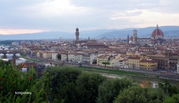 过了桥沿着河边走一段,在转南往上坡走,坡顶就是米开朗基罗广场(Piazzale Michelangelo)。从这里俯瞰,才能真正感受到翡冷翠的美,夕阳下阿诺和静静流淌在一片红瓦屋间,圣母百花大教堂醒目地立于其中。吹着晚风,看着美景,那种感受是文字和图片无法表达出来的。