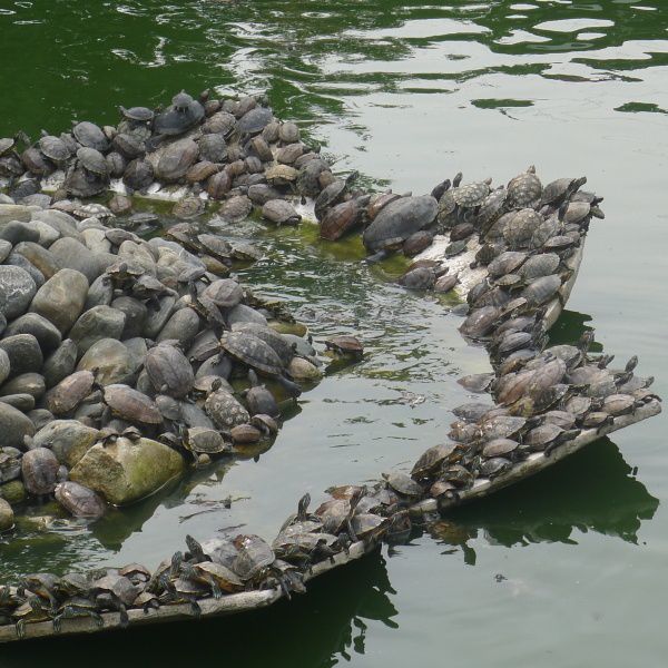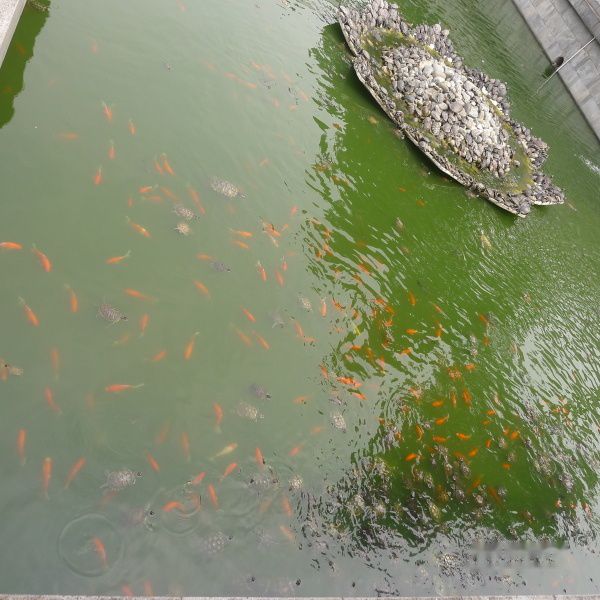 放生池不外乎就是石砌的池子里面放水,放养一些鱼、龟之类的生物,而此处却是在池中间用水泥板和鹅石堆出了莲花的形状,而池中放养的龟则趁阳光正烈,纷纷爬到上面将头高高昂起取暖,由于颜色和形状与石头相差无几猛然一看还以为是由乌龟自发堆成的莲花呢!像神迹一样!池中另有红鲤若干,出于碧水围在“莲花”四周水面与龟争食,十分热闹好看!