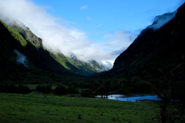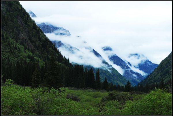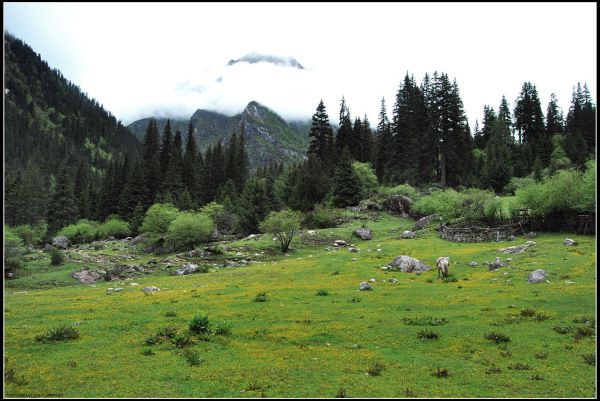 骑马游长坪沟大约要7-8个小时,8:00多出发,走走玩玩儿要到下午4:00才能出来。先后在二道坪、上、下甘海子休息了一下,下午一点到了长坪沟头上的木骡子,一片开阔一些的牧场,一群牦牛,两边全是高耸的山峰。但最上面有雾,雪山看不完整,今天一直处于多云天气,四姑娘山一点也没露出来。整个长坪沟就是原始森林,几乎没有其它别样景色,比我之前了解得到的想象差远了,也许是因为天气原因?但这样的景色与12个小时的车程和它的门票及马费不成正比。当然,如果你喜欢骑马行驶在泥泞原始森林中的过程另当别论。