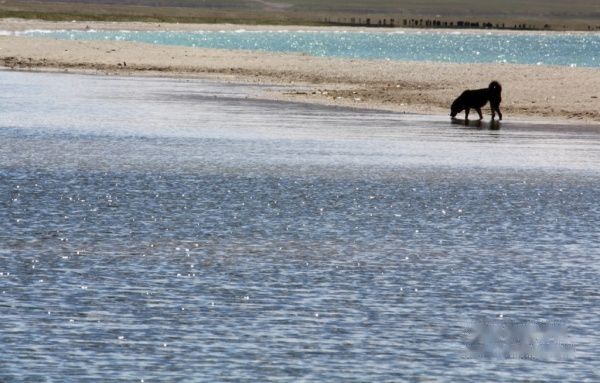 近岸边的湖水,湖面是纯纯的淡蓝色,依然泛着银光闪闪,狗狗也陶醉了。。。