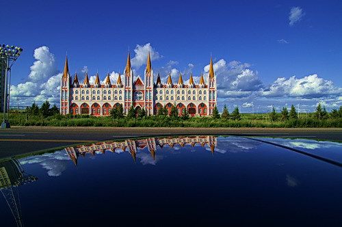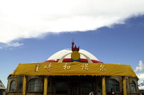 摘了满地的韭菜花,看到东边日出西边雨的美景。。。。来到内蒙不得不提的人就是成吉思汗,于是进入大营参观一通,感觉还不错,摟了蛮多照片,其中一张被嘲,右下角居然有厕所的箭头,嘿嘿。晚19:00坐上由海拉尔飞呼和浩特的飞机。