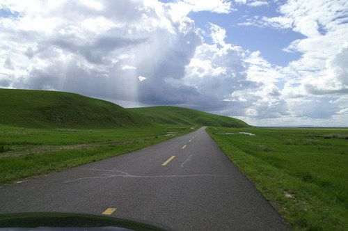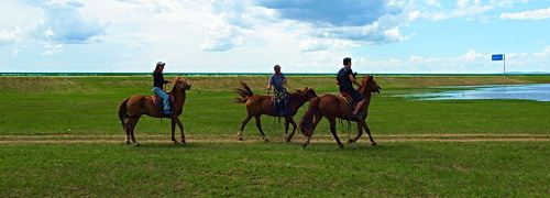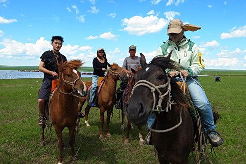 由于wing姐倒后胃口不开,郭和maple特地乘晚饭散步时找到了肯德基爷爷(贴心啊),第二天一大早直奔那里点粥来喝,没想到司机大哥说不吃,继wing姐后,司机大哥也没撑住,看来只有maple最坚挺了,依然神气活现的。走在满洲里街上,人会产生些许错觉,因为满街的俄罗斯牌照的车和满大街俄罗斯人,连城市雕像也具有异域风格,踩了别人鞋了也赶忙用英语说sorry,这是怎么了,这是在中国国土上吗?哎呀,不管啦!继续前进!达赉湖只是远眺了,近观的话可能又要失望了,为了保护生态呼吁不要再过度开发了呀。这一路的草原上多了些大雨过后遗留下来的水潭,一大群枣红马悠然得在水潭里纳凉,下车赶紧摟吧,没想到被牧民精湛的马术给吸引,大家一致的心声:骑马!因为这里不是搞旅游业的所以和牧民好说歹说每人50元骑马。