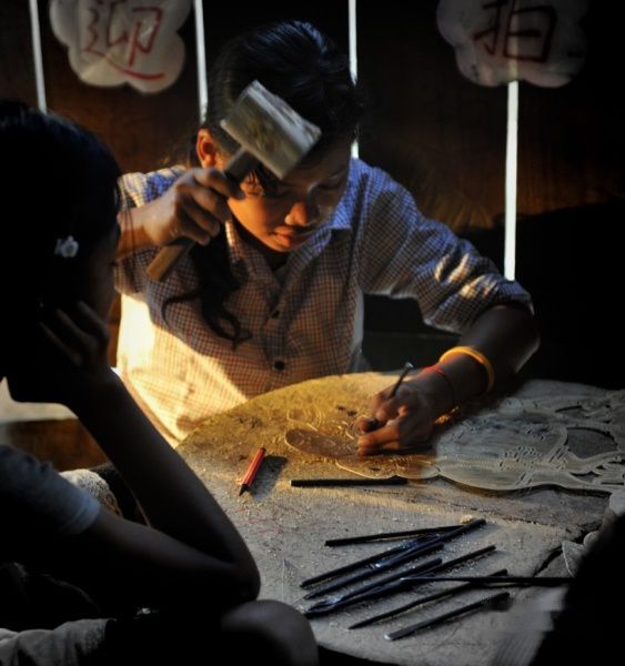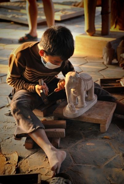 在罗洛士群景区附近,集中了不少孤残儿童救济中心,有的是由寺院开办,有的是民间自发行为。在公牛寺的对面,我们看到几家售卖纯手工艺品的作坊,有丝织品、皮影雕刻和石雕,最初我们仅以为是普通的工艺品作坊进到里面才发现,都是些大小不一的孩子在工作。