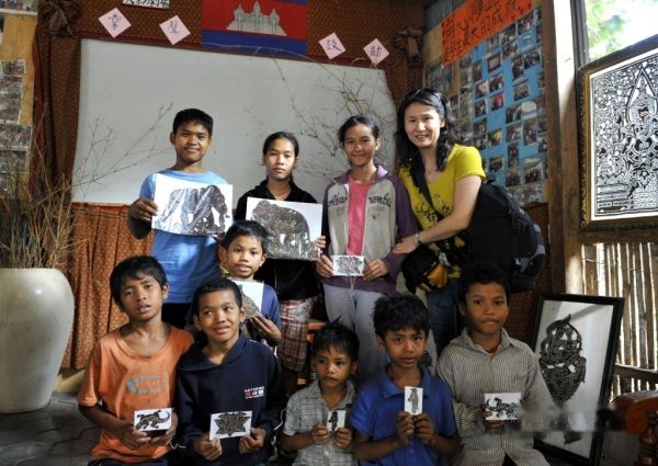 看到墙壁上的照片和文字说明以及司机的解说才知道,房屋的修建、生活设备的增加及绝大部分的日常支出都来自于慈善捐助,包括台湾、大陆及海外。救助中心的主人也是他们的老师,孩子们上午上课,学习英文、中文和柬文,下午工作,虽然出售商品获得的收入只能用来贴补不足20%的日常支出,但孩子可以掌握一门谋生的技艺。作为普通的游客,我们所能尽的绵薄之力也就是尽可能多的选购些他们的手工艺品,但他们所表现出来的感激之情让我们有汗颜之感,被选购的作品和它的小作者与我们一起合影留念。在我们返程回暹粒的途中再次路过这里借用洗手间,孩子们已经开始的课余工余的休息活动,残疾的孩子坐在轮胎制成的秋千上看着其他孩子们打着板球,一派祥和。最让我们意外的是当我们的车启程离开的时候,老师带着所有的孩子们站在路边向我们合十送行,用中文向我们齐声感谢和告别,我们何止是受宠若惊,几乎忍不住落泪,只可惜我有没来得及掏出相机把这一切都拍下来,但那场景深深的烙印在我们每个人的记忆当中。。。。。。