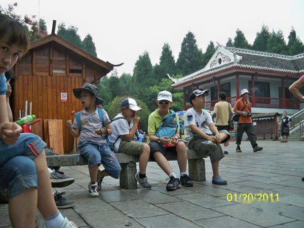 21日游贺龙公园,姐妹峰。小不点还是休息,导游继续陪孩子。吃早饭时,我取了找到位子放下,再去取别的。小不点取了一点坐在我旁边,我取回来看到他,很奇怪,他离同伴,老师,导游都很远啊。与小学生同游很轻松,很有趣。慢慢的我知道老师一个是80年出生的体育老师。大的49岁了带了2000年12月出生的儿子同来玩,学习。他在日本学了9年,回上海办了教学下日本象棋比赛课的。今年一月带这仨学生去日本比赛很好,放假了带来游玩,多学点。他还学了二年心理科学。所以小孩全是自己带包,全靠自己劳动。这几个孩子都很聪明。父母都信老师的教育培养。