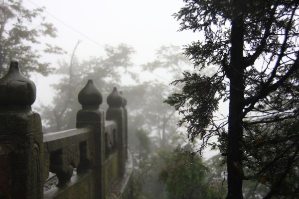 终于在8点40到了1600多米的金顶``过南天门```这是人间和神仙的区分门```下面是云海或者是雾``真有云仙雾中走的感觉,实在顶不住了``70坐缆车下来吧```坐车到太子坡``又转到紫宵宫``逍遥谷```看到两家在拍电影。