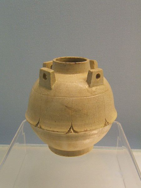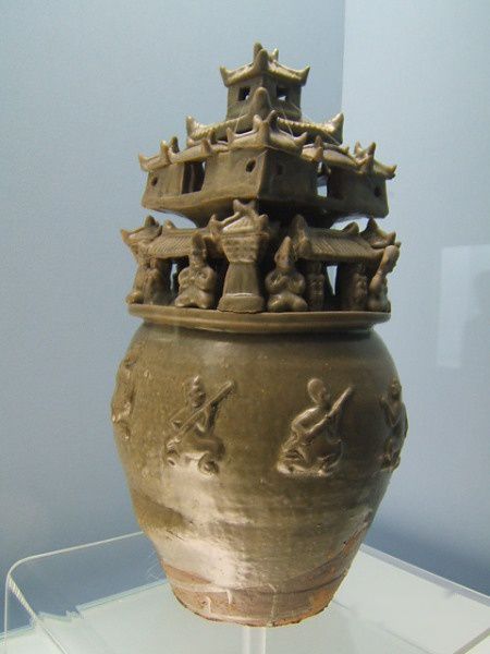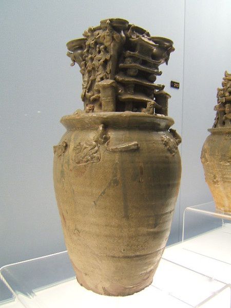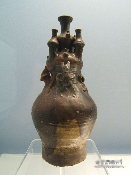 由东汉后期发展起来的五联罐,演变到西晋时,瓶的上部器型出现塔式楼阙,下部是罐身。环绕罐腹有贴塑、浮雕、纹刻,常有团龙纹、铺首纹、狮兽纹等,甚至出现人物画像如乐伎奏乐、人物骑马像。
