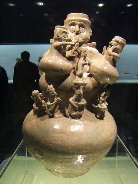 五联罐始烧于东汉,多出土于江南地区,是随葬用的冥器。早期器形简单,很少见有堆塑。后来,装饰日渐繁复,堆塑很多人物、动物。到了西晋演变成谷仓罐,具有很高的艺术价值。