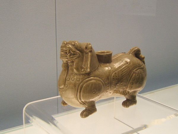 此器塑成狮头兽,作蹲伏状,腹部两侧刻划双翼,四肢有力,肢体强健。狮仰首挺胸,器身刻划和模印直线纹、斜线纹、圆点纹、弧线纹,刻划细致、生动,背塑一 直筒形流口。釉青黄色,釉面光洁匀称。这是一件艺术性和实用性相结合、工艺技巧和艺术价值很高的作品。