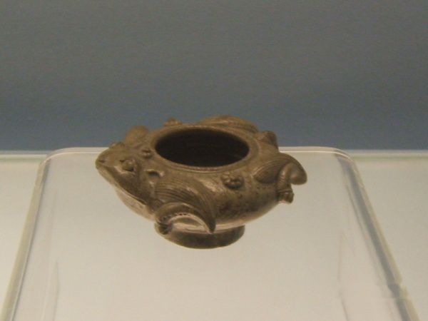 此水盂,青釉,胎体较厚,扁腹,圈足,在水盂腹上部塑蛙形头尾和四肢,利用水盂为蛙体,设计十分巧妙,蛙头栩栩如生,四肢动感十足。