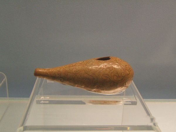 此器胎质坚硬细腻,通体釉色滋润明亮,呈青黄色。其形似茄子,一端圆鼓呈腹,另一端为细管状流,腹部有一鸡心状小开口,造型小巧玲珑。器身刻卷枝纹,线条自然流畅。从传世实物看,南朝流行的刻花纹样主要是莲瓣纹和忍冬纹,像这样以双线刻划而成的卷枝纹,实为罕见。