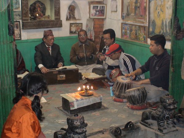 夜晚在街上闻得歌乐起,循声走进一小巷,看到六人盘腿围坐小室内,墙上贴满各种神像,各人掌玩着一、二件乐器,面前摊开经书,边奏边唱。结束前的两首要点上一盏五瓣的油灯来唱,一首完后,油灯捧到到各人面前,用双手摸摸灯火再往自己的脸从上往下一抹,然后再唱最后一首。油灯也捧到了我这个唯一的观众面前,我受宠若惊,急忙学着他们的样子,恭恭敬敬接纳神恩,感谢他们的友善。自此,听这家人每晚半小时的唱经就成了我在加德满都的固定节目。最后那一晚,他们少了两个人,要我替上!虽然我不懂得他们的神,但受到邀请参与他们的神圣事情我感到非常荣幸!我脱鞋进去盘腿坐下,拿起最简单的两块木板给他们打拍子,他们还不停的用眼神和小动作鼓励我一起唱! 呵,我唱的他们的神能听懂吗?经乐高潮处螺号鸣响,铜铃争脆,鼓手十指翻飞……
