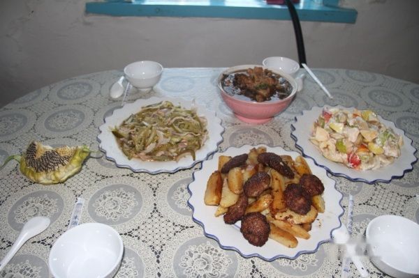 晚餐,那个土豆烧牛肉饼叫嘎巴列还是什么很美味,菜都是俄罗斯大妈家自己菜园里种的,桌上的向日葵是刚刚摘下的,瓜子还透着足足的水份,董师傅带我们来的,这时候发现找个好司机就是一本活的攻略。