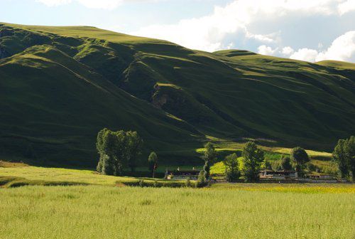 下了折多山,美丽的新都桥,象一幅幅丝绒的画卷,渐次展开。现在是夏季,色调比较统一,深深浅浅的绿,混合被朵朵白云遮挡下的亮亮暗暗的阳光,令人心旷神怡。听说最美的季节是秋天,五彩斑斓,绚丽无比。